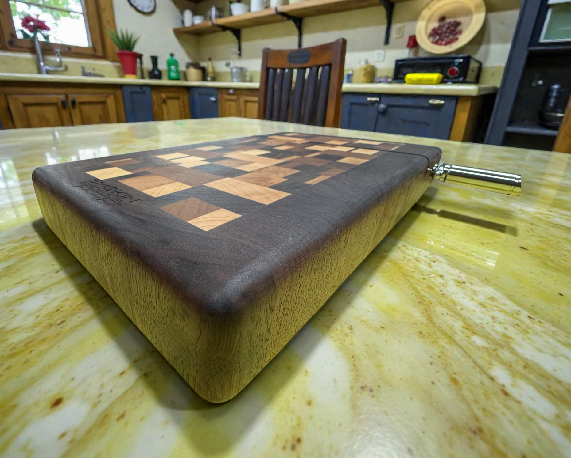 Our Kaos End Grain Block & Cheese Slicer is a true showstopper. This unique duo is crafted from the finest hardwoods of the Midwest, including walnut, cherry, ash, maple, and oak. The block and cheese slicer boast an elegant yet bold appearance that is sure to catch everyone's eye. The block measures 23.5" x 15.5" x 1.75", while the cheese slicer measures 12.5" x 6.8" x 1.75". These boards feature a stunning end grain chaotic pattern, trimmed in end grain walnut. If you need a product that is durable enough for everyday use yet glamorous enough for your holiday prime rib, this is the perfect choice for you! Both of these blocks come equipped with rubber feet, ensuring a stable and non-slip experience. Whether you're using them for your kitchen or BBQ Pit, you can be confident that they will stay securely in place, providing you with the stability and safety you need.