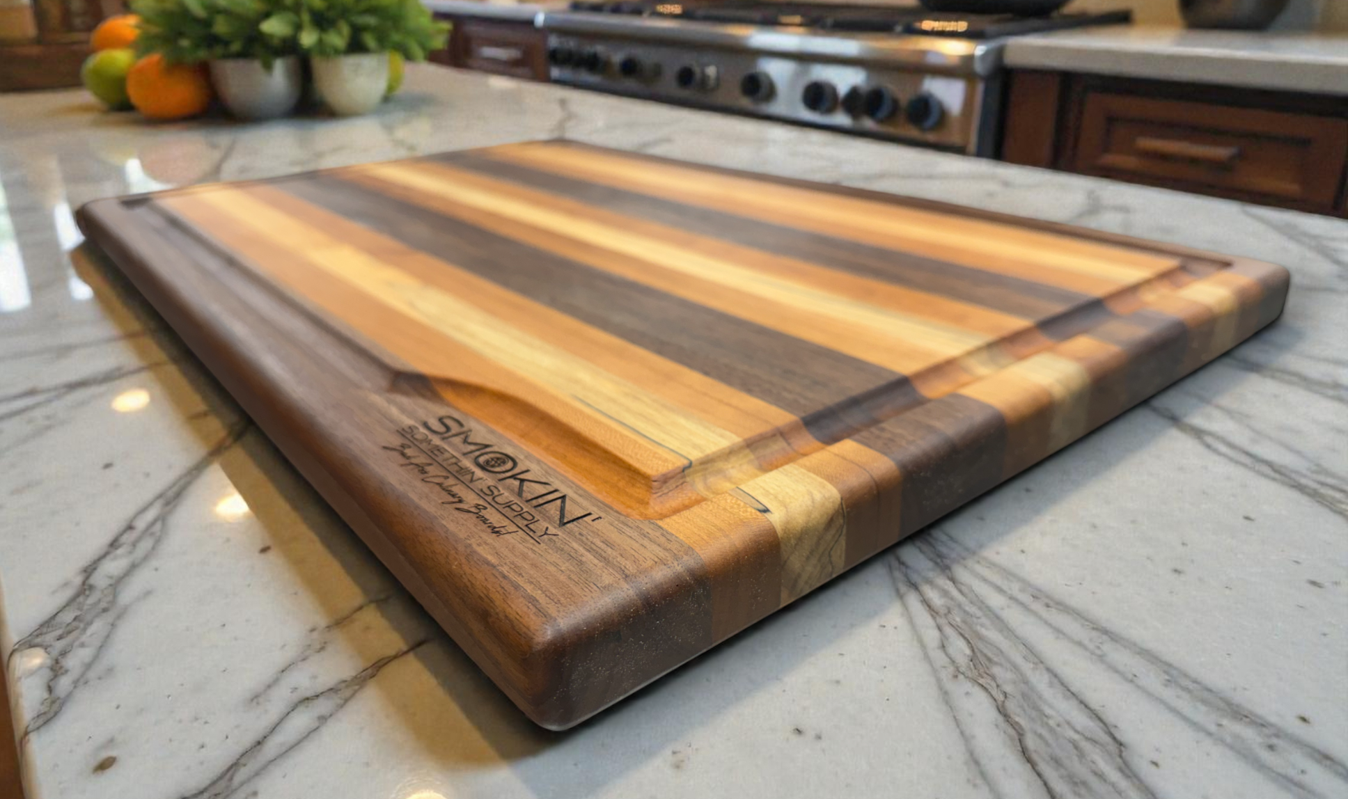 Our Large Edge Grain Cutting / BBQ / Prime Rib Board is a true showstopper! These stunning boards are meticulously crafted from a variety of premium hardwoods, including Maple, Walnut, and Cherry. Perfect for the kitchen, they can handle holiday hams, turkeys, or prime ribs with ease. Built tough for the BBQ, they are robust enough to accommodate racks of ribs, brisket, butts, or anything else you can throw at them. Plus, they look amazing! Featuring an impressive 3/4" x 3/8" juice groove to prevent spills, these boards measure 23 3/4" x 15 3/4" x 1 3/8". Showcase your culinary masterpieces at your next gathering with pride!